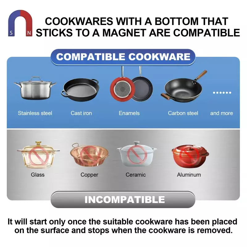 【FAST AND SAFE COOKING】:FCC approved.This extra-large commercial induction cooktop with max 5000W(240V) .The commercial induction cooktop is not cyclic/pulse working in low levels. and has a large coil, which has both a full power stage for fast heating and a low power stage for keeping warm.high rate heats faster than a normal electric burner, hot plate, oven or a cooktop stove.When the temperature is overheating or the pan is off the surface, the induction burner will stop working.