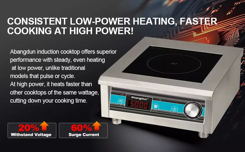 【Even Heating at All Power Levels】:Unlike other induction cooktops that use pulsing or cycling at lower power levels, the Abangdun induction cooktop provides continuous, even heating at all power settings. This eliminates temperature fluctuations, ensuring stable cooking results every time. Equipped with a 9.25-inch large coil, it offers a larger