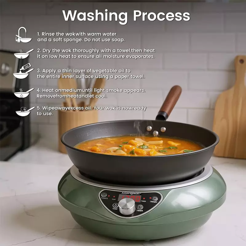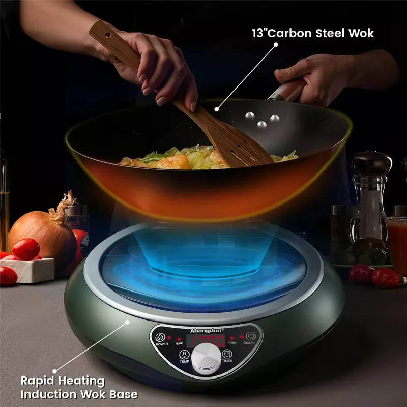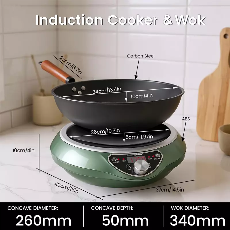 FRIENDLY REMINDER: This concave induction cooktop has a shallow curve, so it doesn’t require a perfect match with the wok’s curvature, as stir-frying involves tossing the wok. The concave coil ensures effective heating within a certain distance range, providing stable heat even if the wok’s curve isn’t exact. It is also compatible with flat-bottom pans with a diameter smaller than 9 inches.