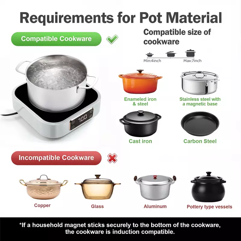 Adjustable Settings Burner: This portable induction cooker with a power range of 200W to 700W, this mini hot plate offers six adjustable settings, providing precision control over your cooking process.